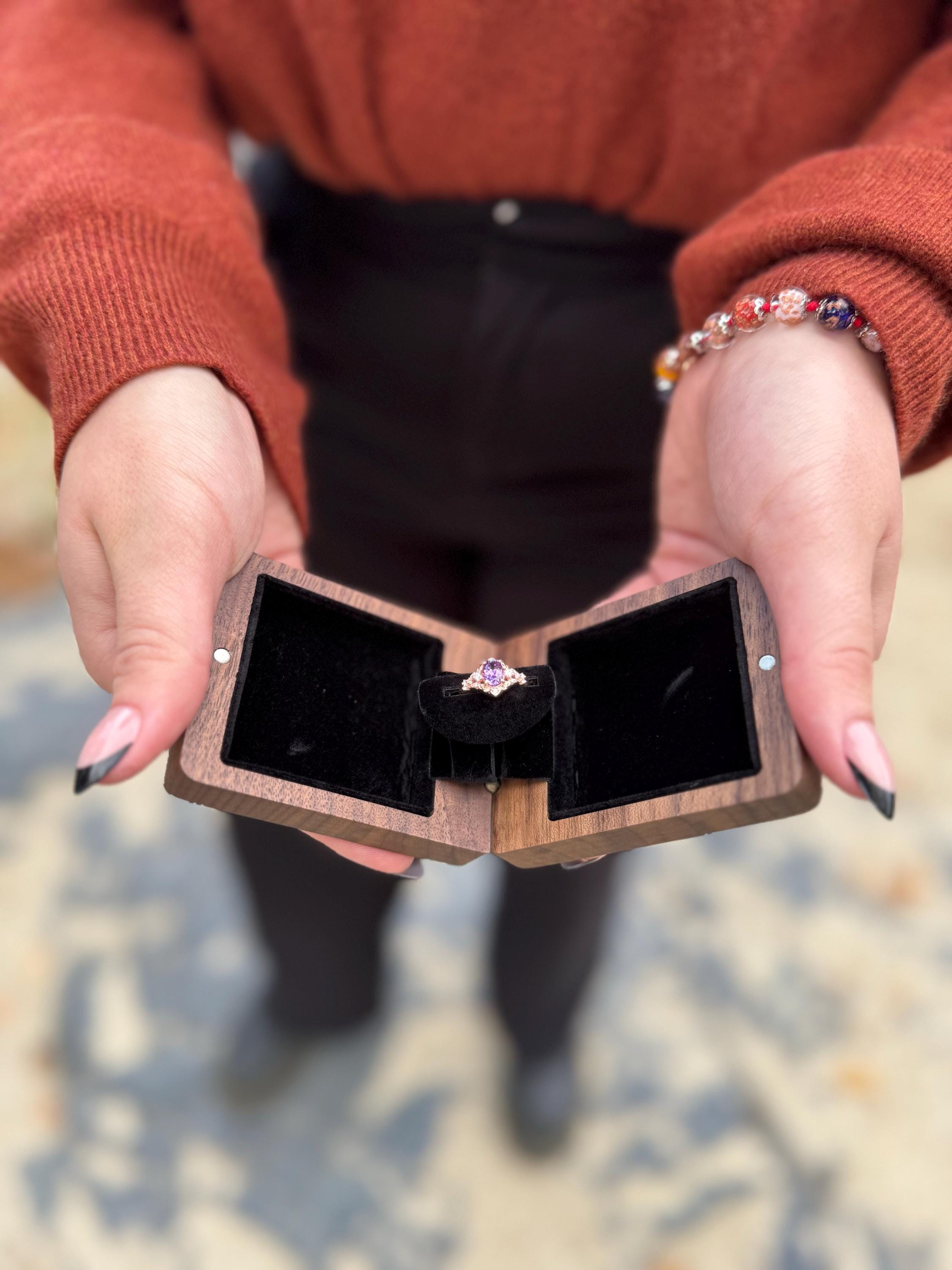 This ring would make a beautiful unique engagement ring or promise ring as well as anniversary gift. It comes in a gorgeous rose wood ring box, ready to present.