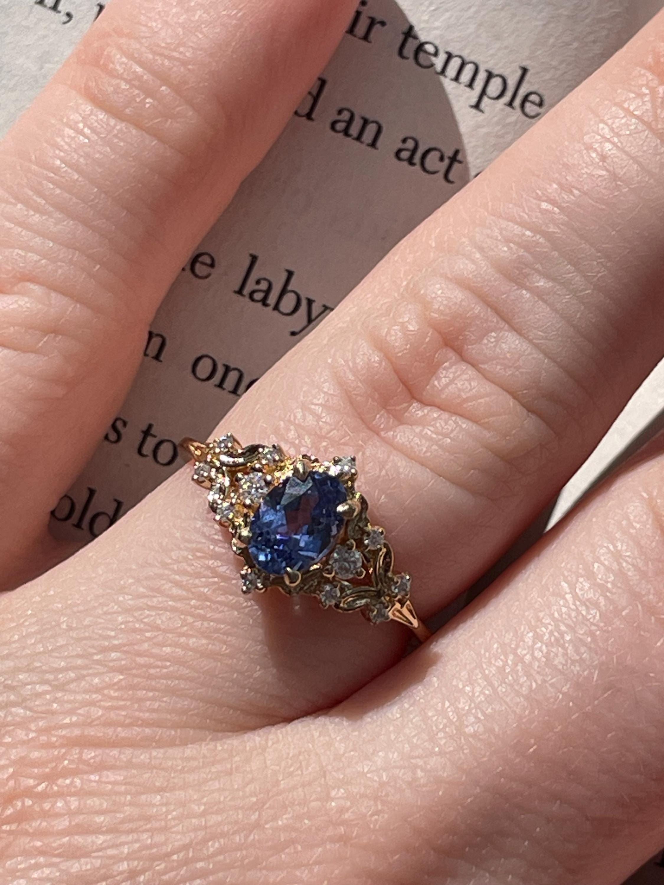 This engagement ring features an 1ct cornflower blue sapphire. The sapphire is sparkling and clean. It is set in fantasy inspired setting, 14k Gold, 12 white natural diamonds or moissanites on the sides.