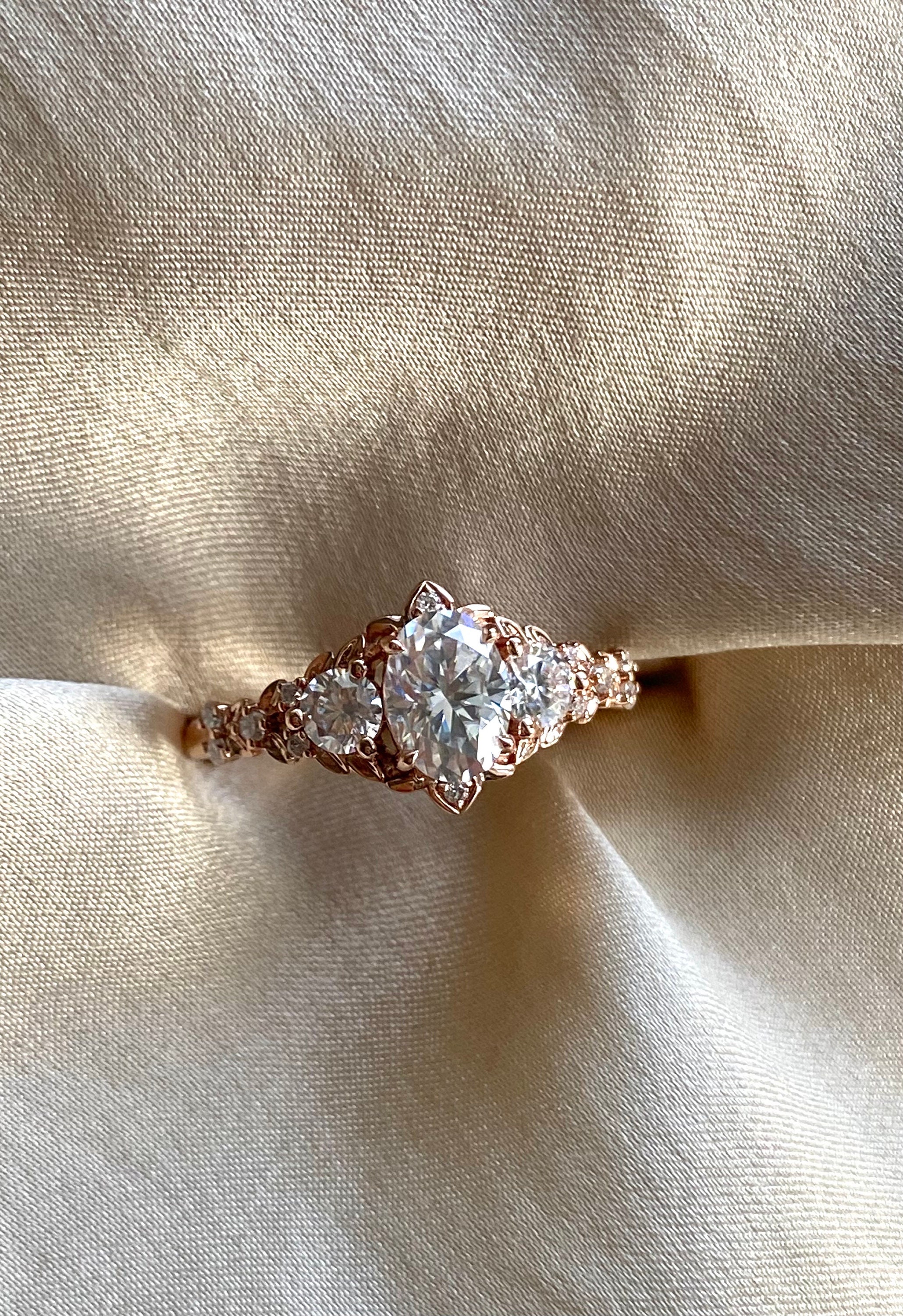 This elvish fantasy inspired engagement ring features a 1ct white moissanite (5x7mm). It is set in a one-of-a-kind setting in 14k Rose Gold and 12 white accented moissanites on the sides. This ring would make a beautiful unique engagement ring or promise ring, as well as an anniversary gift. It comes in a gorgeous rosewood ring box, ready to present.