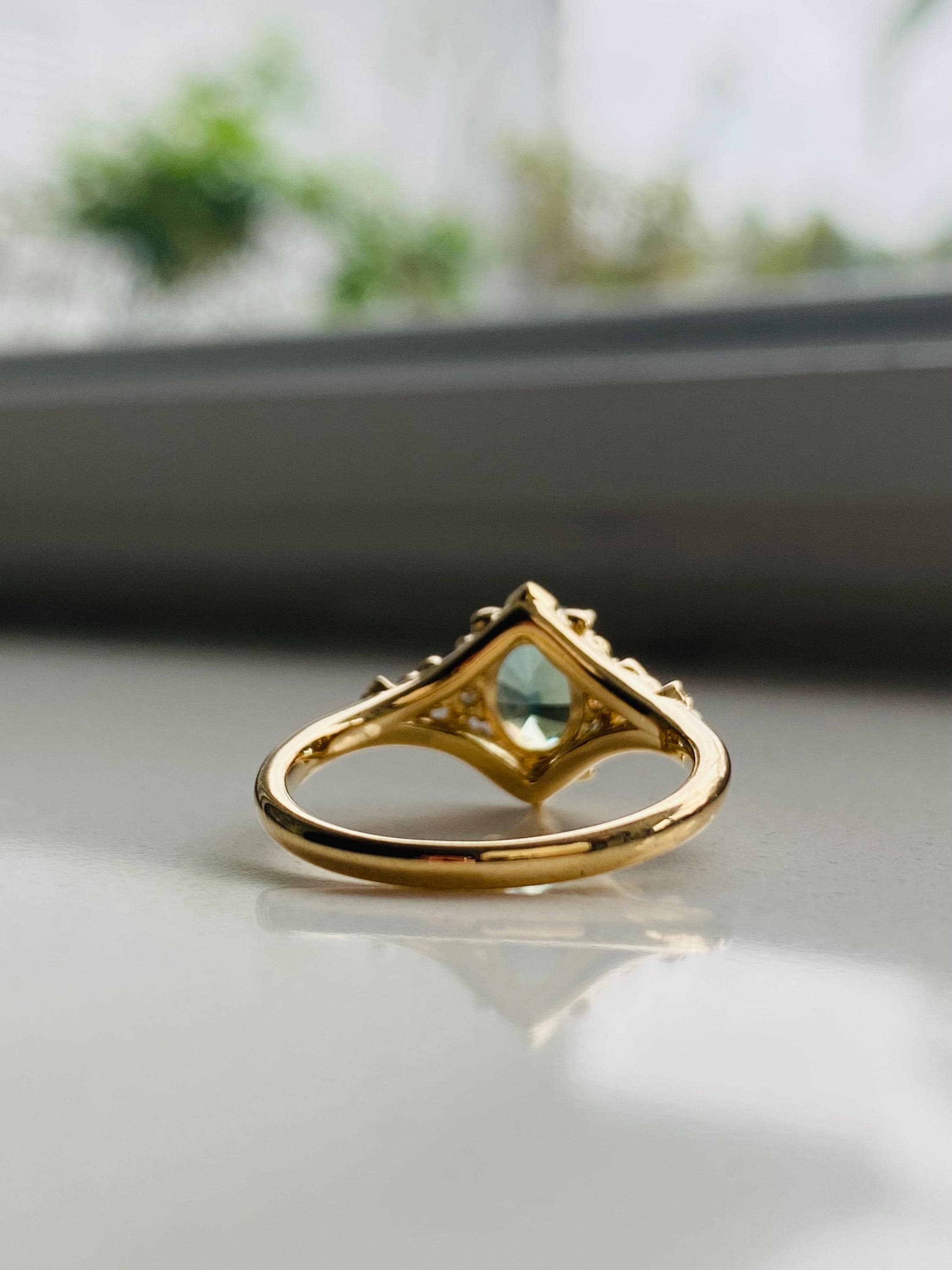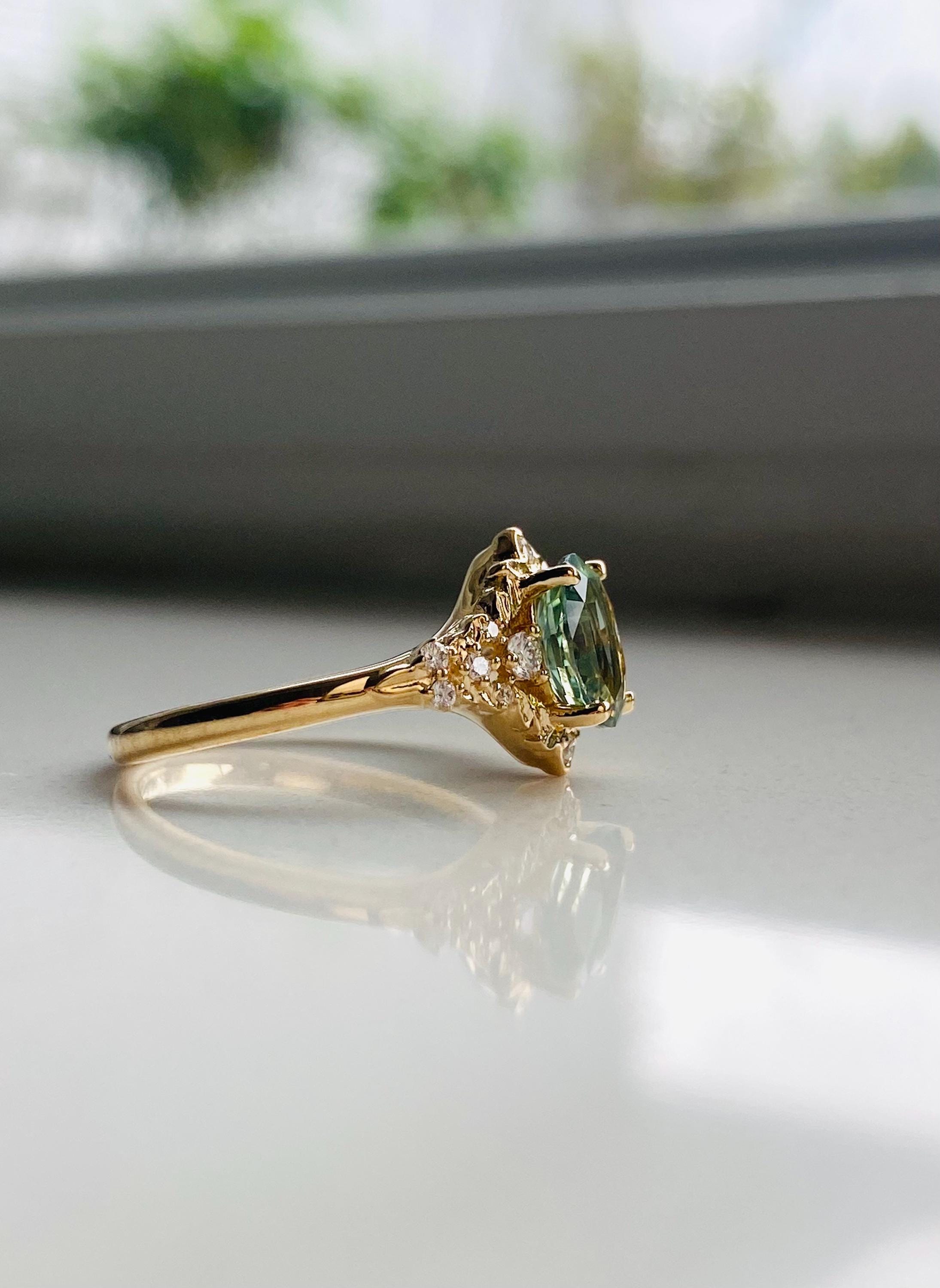 This engagement ring features a natural 1.5ct teal sapphire. The sapphire in unheated, sparkling and clean. It is set in a OOAK setting, 14k Gold, 12 white diamonds on the sides.