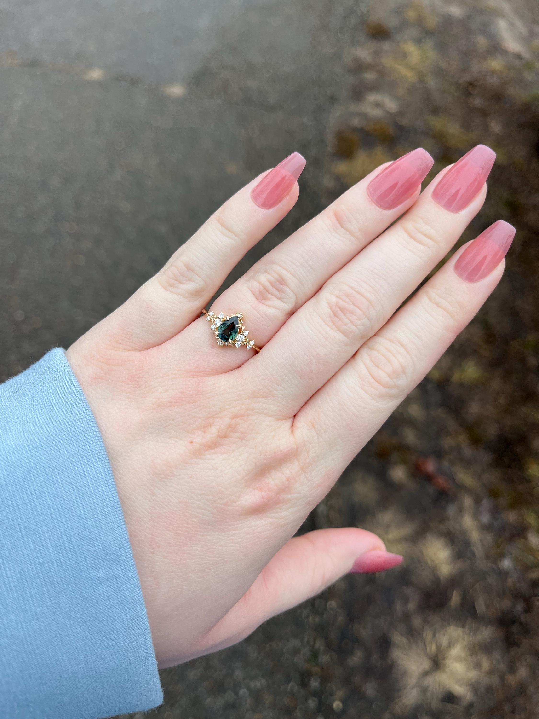 This engagement ring features a gorgeous pear cut natural sage green sapphire, 5x7mm, sparkling and clean. It is set our new Dela fantasy inspired setting, 14k Gold, 12 white diamonds or moissanites on the sides.